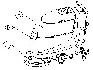 B清水箱 : 是放置清水或清水与清洁液的混合体的容器,是整台机器的关键部件,工作前请先确认水箱是否有液体!