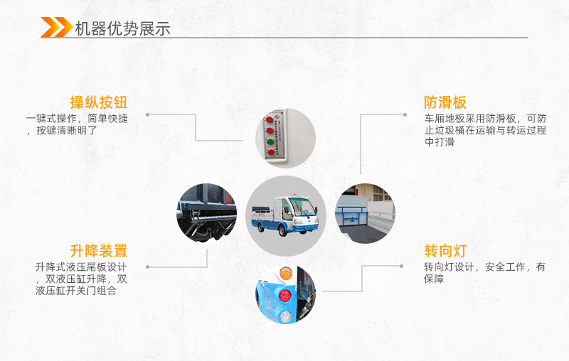 使用功能:灵活小巧,方便收集街道、店铺、小区等区域的垃圾,倾倒方便,即走即停;