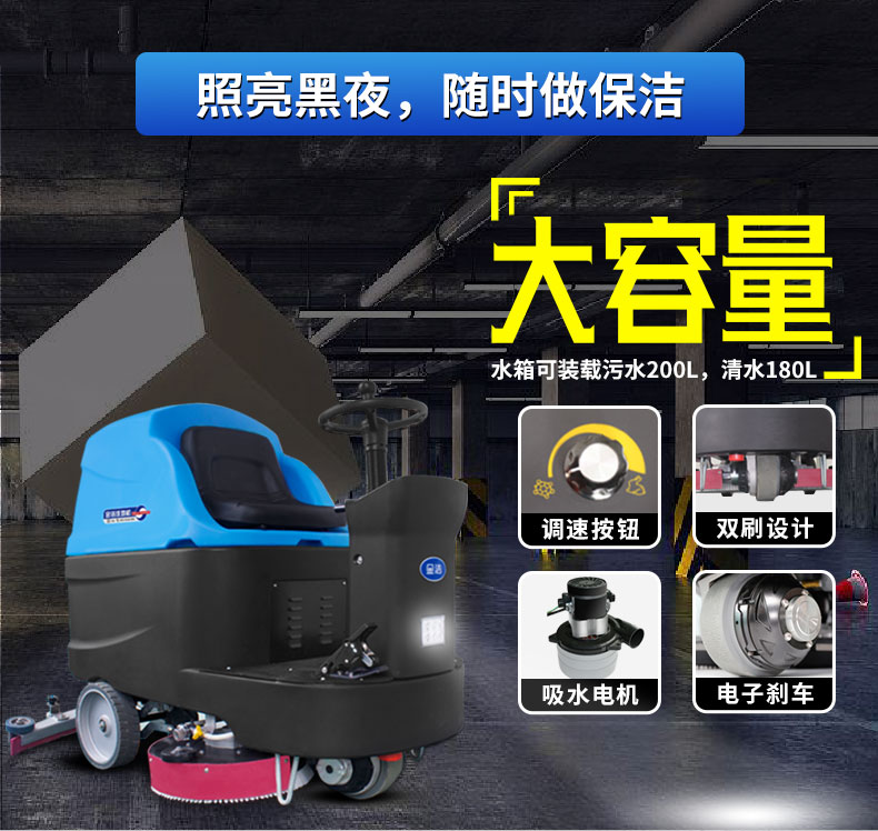 特殊设计: 前置大灯,在一些疑难的场地提供工作视野,前驱设计,速度调节,驾驶操作更安全,一次清洗宽度960mm,清扫干净度高达99%
