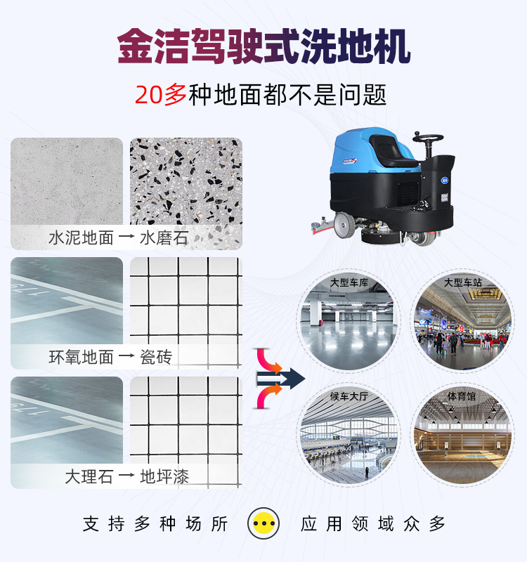 云顶集团3118,又名驾驶式清洁设备,分为大型洗地机和中小型洗地机多种不同体型,移动方便灵活,一个大型场所仅需一台设备即可,当然还需配备一名驾驶员,机器代替人力,一机顶6人,节省成本。我司J-960B洗地机主要用于解决大型车库、大型车站、候车大厅、仓库、物流园等地面的清洁问题。