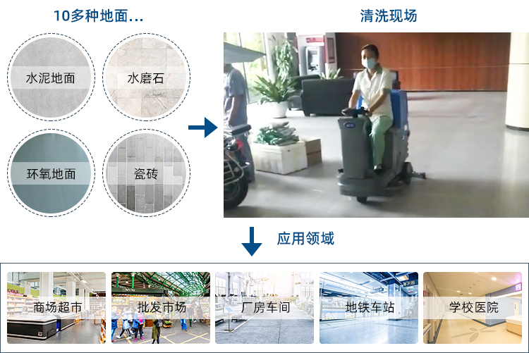 将各种地面污渍通过洗地刷盘加清洁剂清洗,车机尾部吸水扒的吸水胶条会把污水吸走并保证吸干,将污水迅速带离地面,机器过的地面就是干的、干净的。