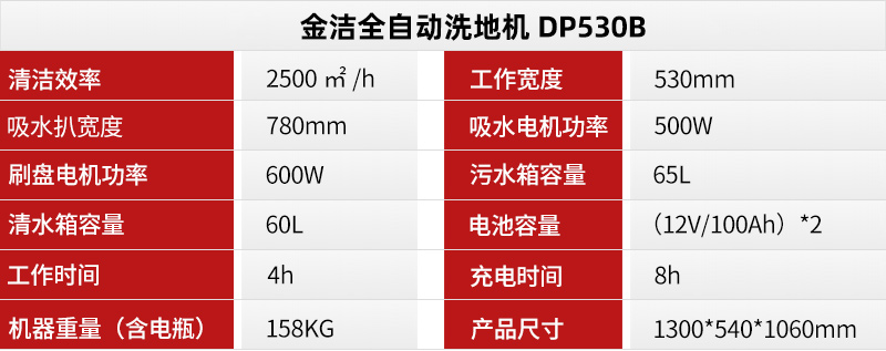 金洁全自动洗地机DP530B可清洗水泥地面、大理石地面、环氧地面、瓷砖地面、金刚砂地面、PVC/木板地面等,仅需一人就能轻松完成日常保洁,其清洗效果是人工清洁所不能比拟的,自动完成地面清洗和污水回收工作.
