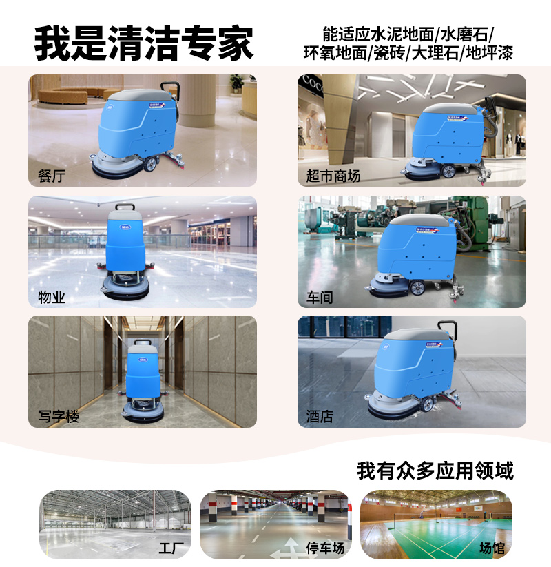 此款手推式全自动洗地机洗擦、吸干一次性完成,洗刷吸干过的地面,洁净如新,脏水、泥土、沙粒、油污统统吸入污水箱;可清洁不同的材质地面,如:环氧树脂地面,油漆地面,混凝土,瓷砖地面等。高效省钱:手推式洗地机可代替并优越于多人清洁地面的效果和效率;小型手推式洗地机并且维护与消耗费用低。