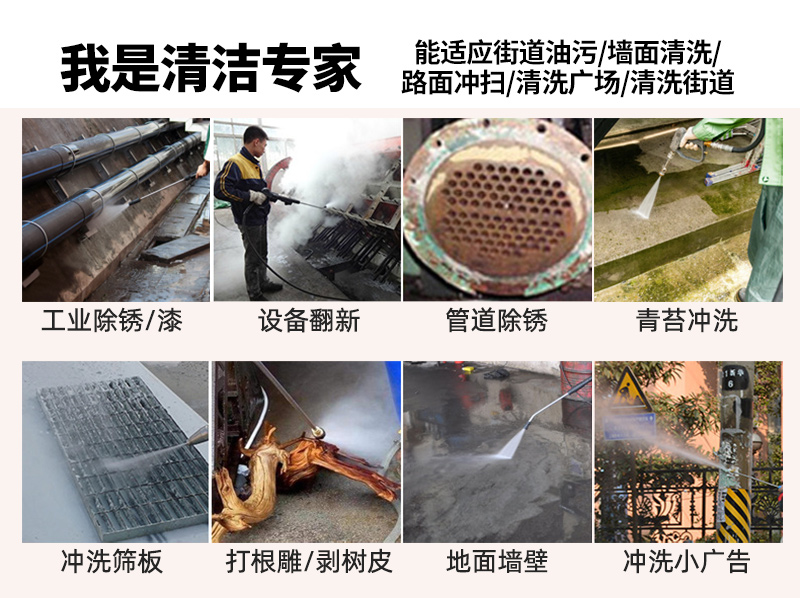 高压清洗机是一种通过水流喷射压力对标的物进行清洗的清洁设备,目前根据动力源可以分为电动高压清洗机和燃油高压清洗机,主要用于室外地面冲洗、台阶冲洗、墙面清洗、青苔冲洗、大型车辆清洗、除锈除漆,户外牛皮癣、小广告清洗。