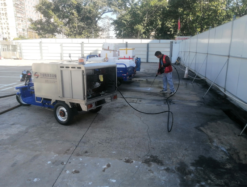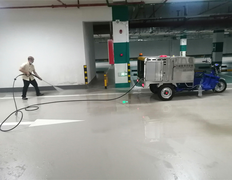 三轮高压冲洗车地下车库现场清洁实拍