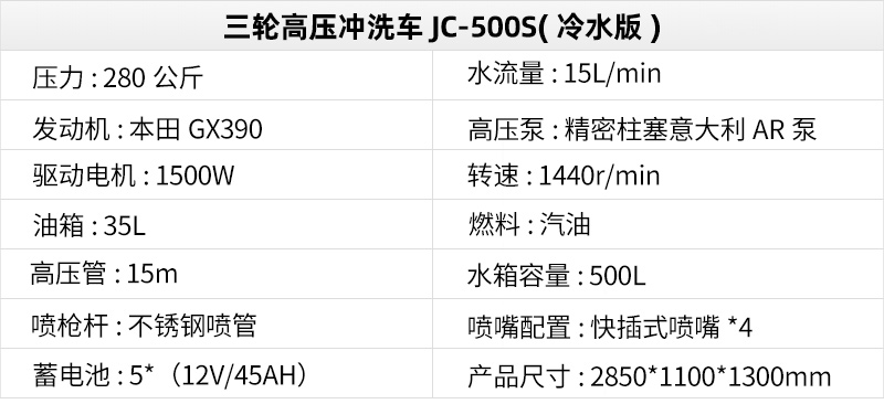 三轮高压清洗机采用本田认证390发动机和意大利原装进口AR泵,性能稳定,压力大去污彻底.适用于街道小区、物业保洁、垃圾站、公园广场等。
