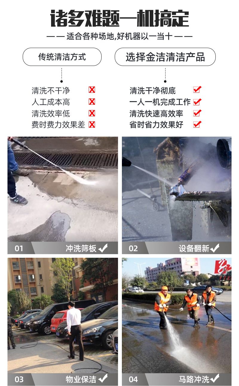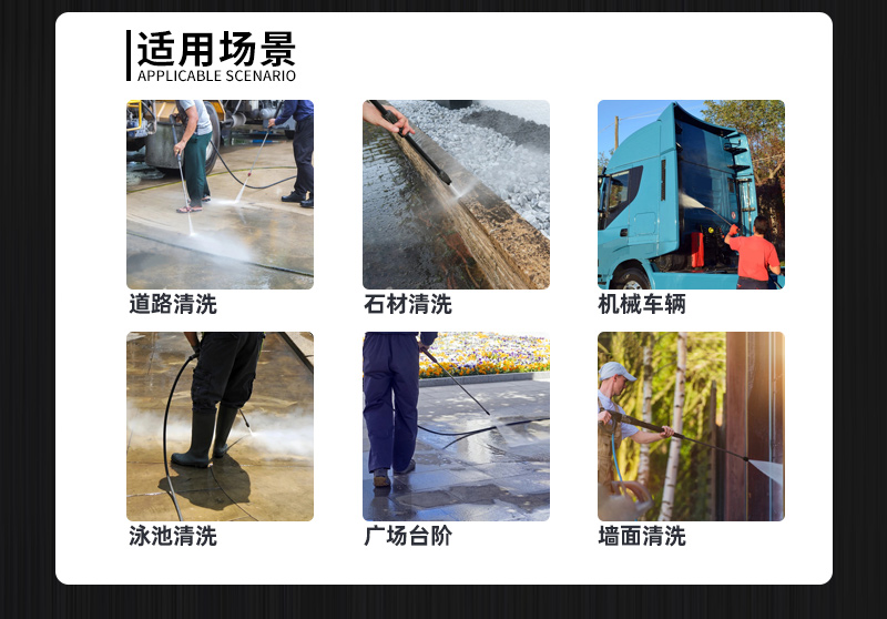 除油高压清洗机应用 高压冲洗机主要解决日常生活中的各种不易清洗(冲洗)的难题,如物业小区、市政环卫、机械工厂等场景,针对性冲洗根雕去皮、环卫清洗、重油污清洗、青苔冲洗、喷砂除锈除漆、管道疏通。